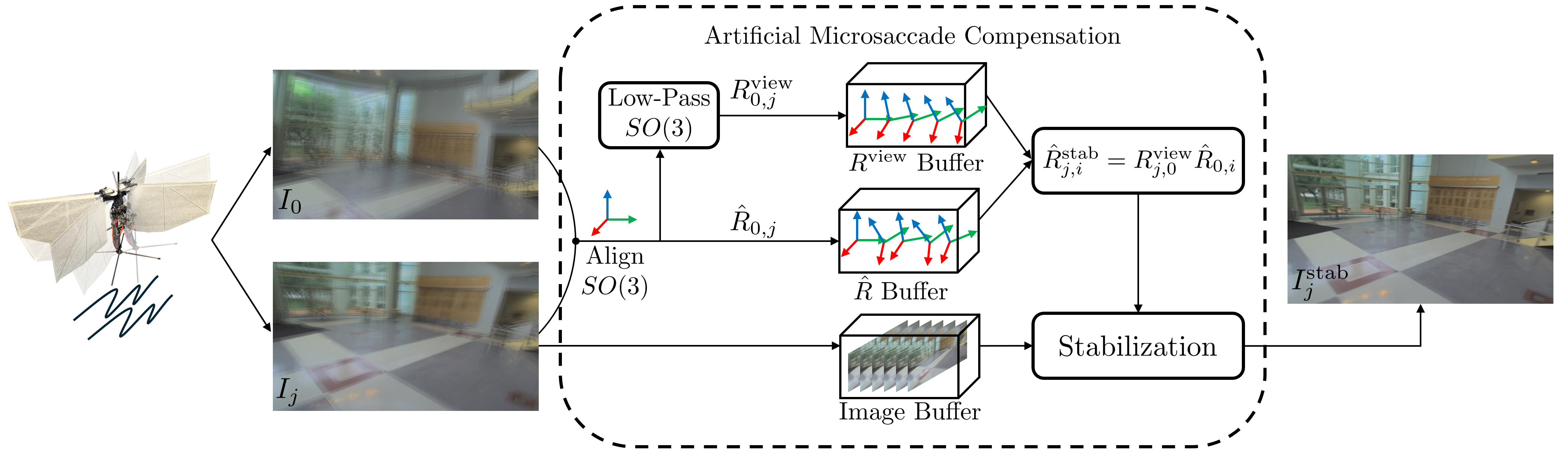 Animals with foveated vision, experience microsaccades, small, rapid eye movements that they are not aware of. Inspired by this phenomenon, we develop a method for "Artificial Microsaccade Compensation". It can stabilize video captured by a tailless ornithopter that has resisted attempts to use camera-based sensing because it shakes at 12-20 Hz. Our approach minimizes changes in image intensity by optimizing over 3D rotation represented in SO(3). This results in a stabilized video, computed in real time, suitable for human viewing, and free from distortion.