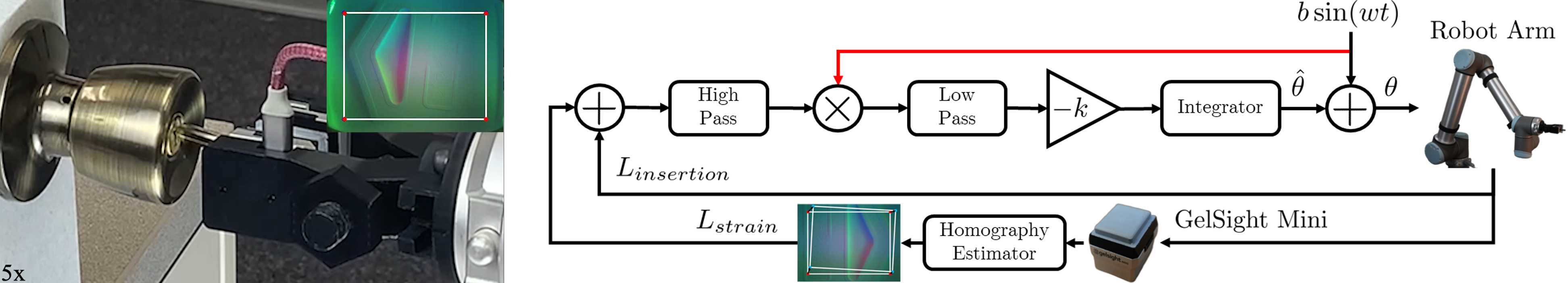 When humans perform complex insertion tasks such as pushing a cup into a cupboard, routing a cable, or putting a key in a lock, they wiggle the object and adapt the process through tactile feedback. A similar robotic approach has not been developed. We study an extremum seeking control law that wiggles end effector pose to maximize insertion depth while minimizing strain measured by a GelSight Mini sensor.